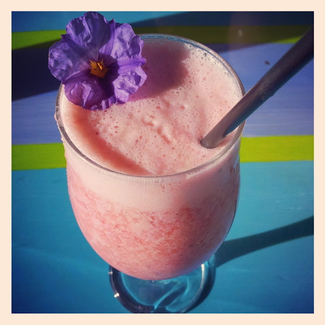 Batido de abacaxi e frutos vermelhos. A florzinha era comestível e foi a primeira vez que comi uma flor.