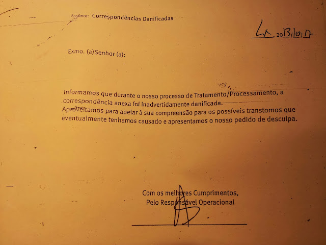 São muitas as vezes que recebo encomendas via CTT com embalagens completamente danificadas, já para não dizer com os artigos partidos ou estragados. Sinceramente, não vejo muitos cuidados por parte destes senhores com a nossa correspondência.  Ontem, junto com a minha encomenda, vinha esta cartinha. Uma carta modelo, que basta pôr a data e assinar, que no fundo diz isto: "Ups! Fizemos asneira outra vez. Mas quem pede desculpa não merece castigo, né?"